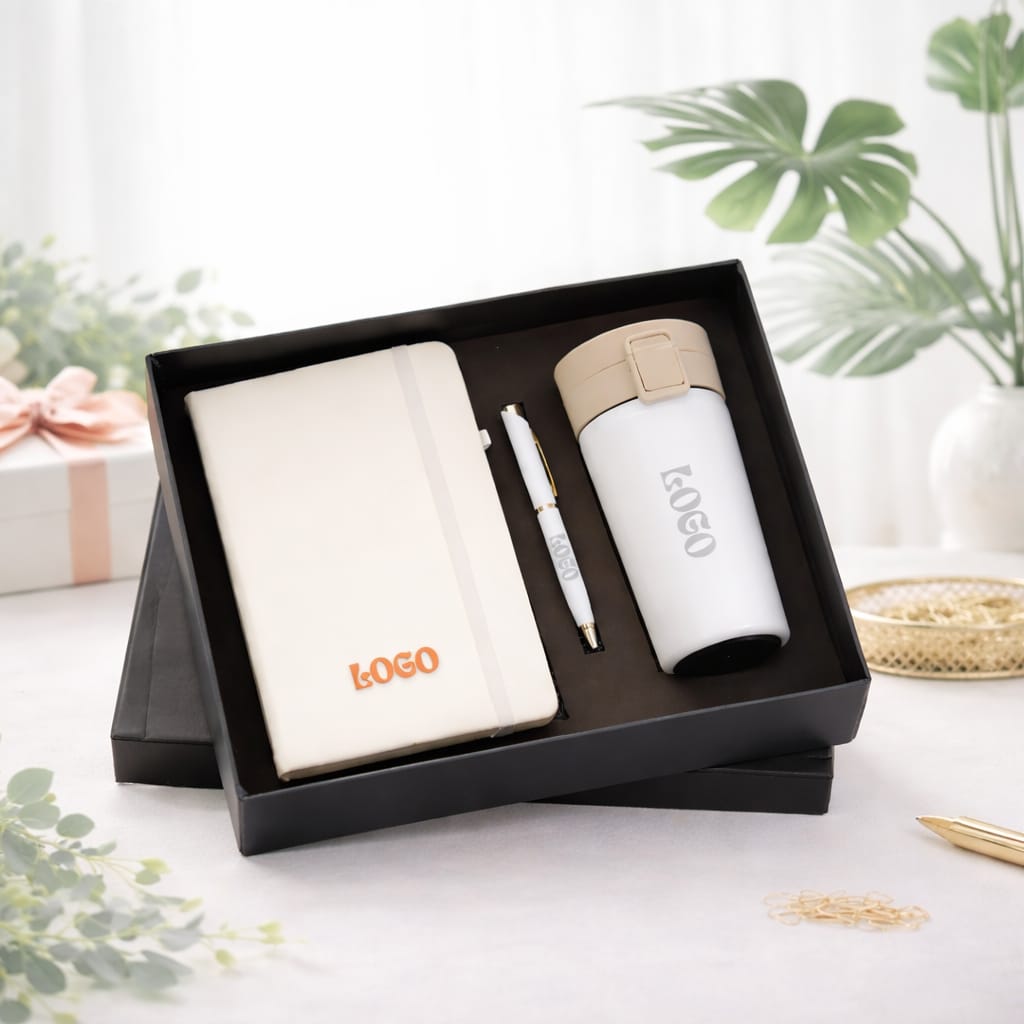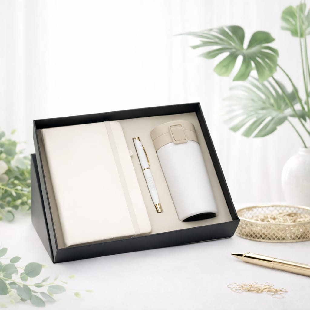 Elevate your corporate gifting game with the DEERA Perfect Trio Gift Set — a stylish and practical 3-in-1 set designed for professionals and everyday use. This premium combo includes a high-quality insulated tumbler, a hardcover diary, and a smooth-writing pen, all elegantly packaged in a presentation box.